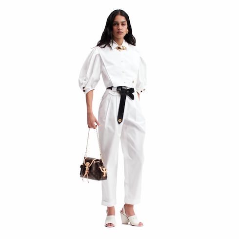 Este original pantalón de estilo veraniego, confeccionado en popelín de algodón almidonado, destaca por su diseño voluminoso de pernera ancha. Presenta una amplia cintura alta, que estiliza la figura, pinzas en la cadera y dos minibolsillos de solapa, que aportan un toque estructurado. Se completa con el elegante cierre de botón bordado y ribeteado en color dorado de la temporada.