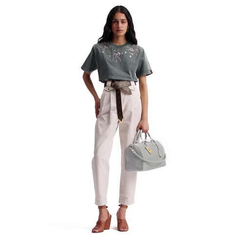 Este pantalón, confeccionado en suave algodón con efecto aterciopelado, destaca por su diseño voluminoso de pernera ancha. Presenta bajos con vuelta y una favorecedora cintura alta y amplia, así como dos minibolsillos de solapa y pinzas en la cadera, que realzan el corte holgado. Se completa con los refinados botones metálicos de la temporada.
