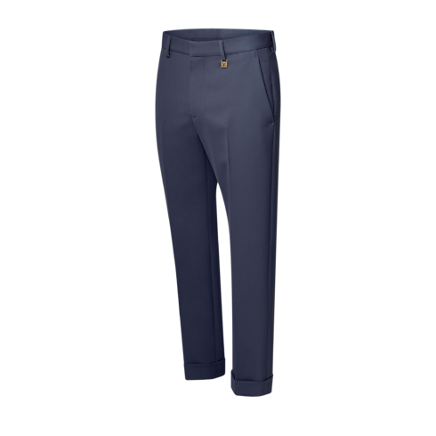 Este elegante pantalón de sastre, confeccionado en lana grain de poudre de un atemporal color azul marino, destaca por un corte cigarette y bajos con vuelta. Luce un medallón con el logotipo LV grabado en la presilla izquierda, así como un distintivo Louis Vuitton bordado tono sobre tono bajo el bolsillo trasero. Esta versátil prenda puede combinarse con la chaqueta a juego para crear un traje moderno.