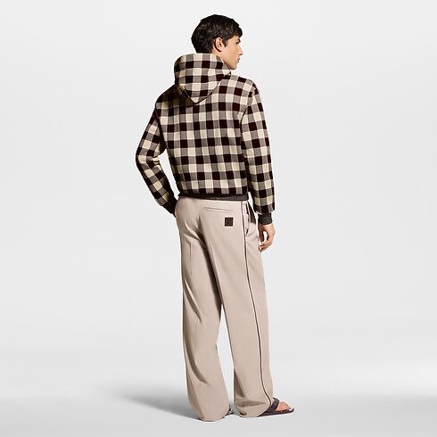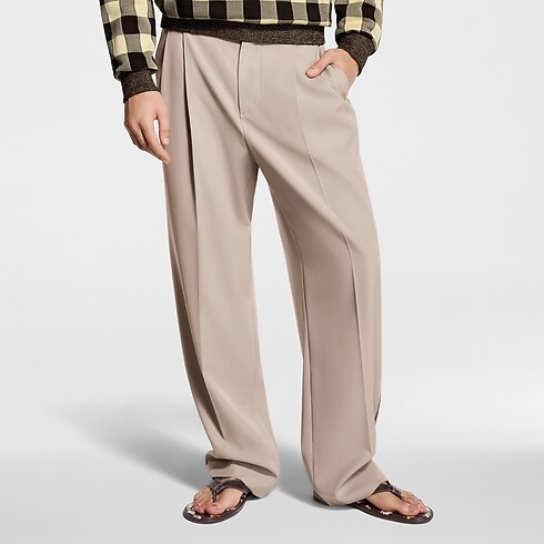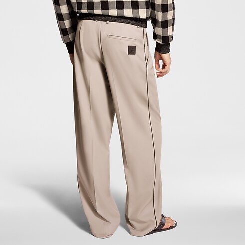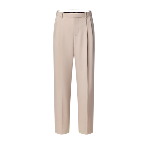 Este pantalón de traje ligero presenta un diseño cómodo y holgado, que se realza con pinzas dobles en la parte delantera. Confeccionado en un exquisito tejido de mezcla de lana color beige, luce sutiles detalles distintivos, como un ribete Mini Damier en la parte exterior de cada pernera y un parche LV High Frequency en piel en el bolsillo de la parte trasera. Esta elegante prenda puede combinarse con piezas clásicas y atemporales o con modelos más deportivos de la colección.