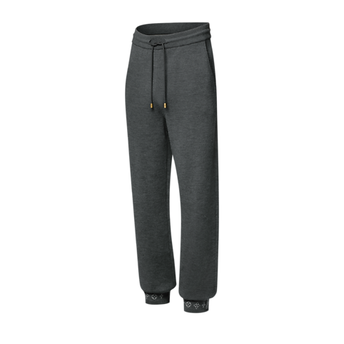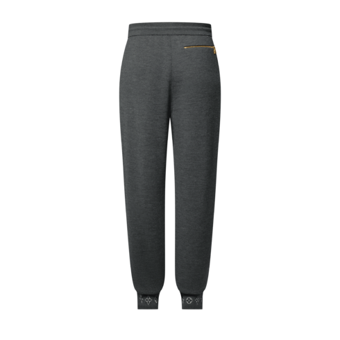 Este pantalón, confeccionado en punto de doble cara, presenta el exterior en lana orgánica de color gris oscuro y el interior en algodón suave. Su diseño minimalista destaca por los bajos con motivos Monogram realizados en tejido Jacquard. Este modelo cómodo y refinado puede combinarse con la cazadora a juego para crear un elegante conjunto de viaje.