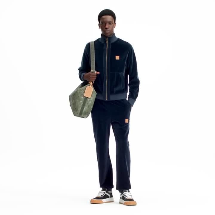 Este informal pantalón deportivo, confeccionado en elegante terciopelo de color azul cielo oscuro, luce ribetes de pana tono sobre tono en los bolsillos. Presenta una cintura con cordón y topes nacarados, que le confieren un estilo dandi, mientras que un parche con la inscripción «Marque L.Vuitton Déposée» en piel VVN adorna la pernera izquierda. Puede combinarse con la chaqueta de chándal a juego para crear un look refinado y casual.