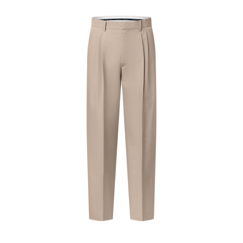 Este pantalón beige en sarga de lana y algodón es un imprescindible del armario. Presenta una elegante pinza doble delantera, un bordado tono sobre tono en el bolsillo derecho y una etiqueta LV de tela en la parte trasera de la cintura. Puede combinarse con la chaqueta a juego para crear un traje contemporáneo o con otras prendas desparejadas para lucir un look preppy.
