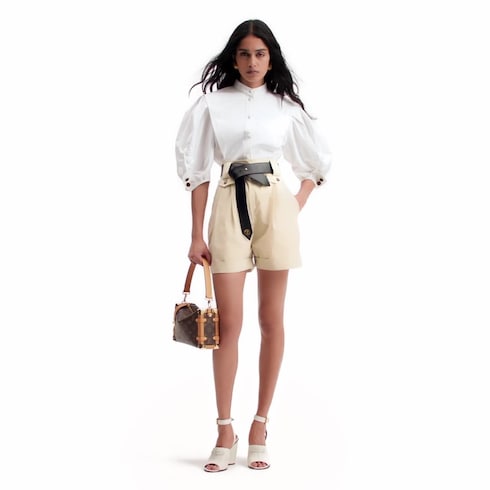 Estos elegantes y veraniegos pantalones cortos se han confeccionado en suave algodón con efecto aterciopelado en un tono atemporal. Presentan un favorecedor corte de pernera ancha fluida, que destaca gracias a la gruesa cinturilla de talle alto. Este exquisito diseño se completa con unos bajos con vuelta, dos pequeños bolsillos de solapa con pinzas y unos refinados botones metálicos.