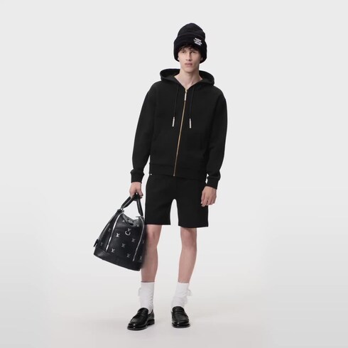 Estos elegantes pantalones cortos, confeccionados en punto de algodón de color negro, presentan bolsillos con cremallera y tiradores decorados con perlas. Se adornan con la nueva inscripción «Marque L. Vuitton déposée», vista en el desfile Primavera-Verano 2024, discretamente bordada en la pernera izquierda. Esta pieza puede llevarse con la sudadera con capucha a juego para conseguir un estilo informal y distinguido.