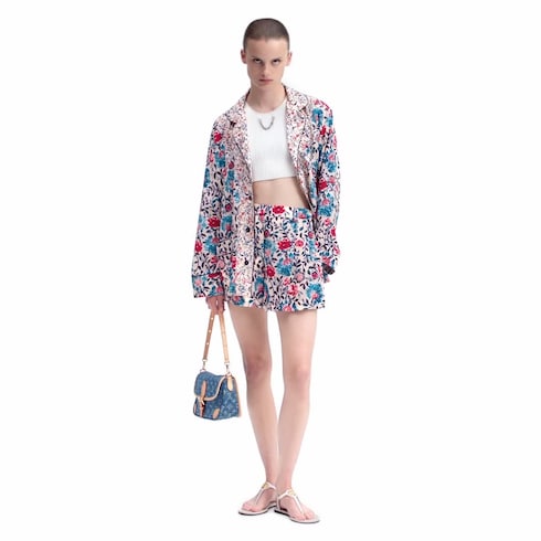 Estos veraniegos pantalones cortos, confeccionados en vaporoso crepé de China de seda, lucen el llamativo motivo de enredadera floral de la temporada. Presentan una silueta fluida, un cierre oculto y pinzas en la parte delantera, que acentúan el volumen de las perneras anchas. Esta prenda elegante se completa con bolsillos de ojal en la parte trasera.