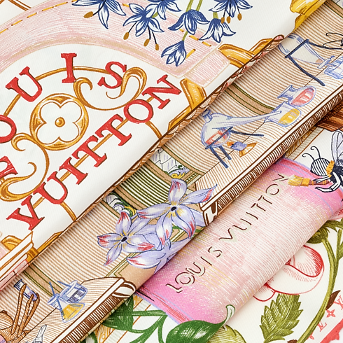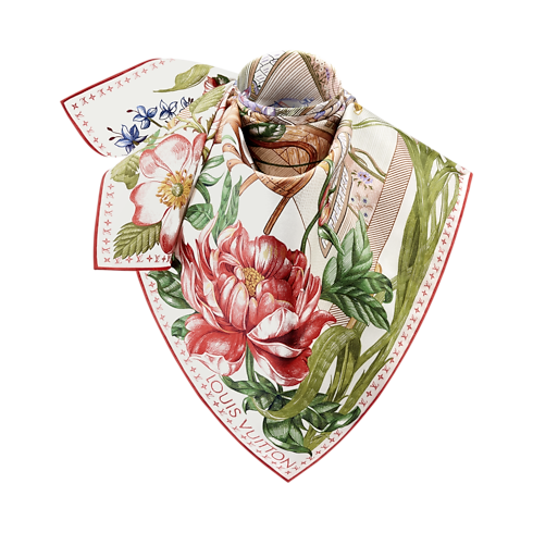 El pañuelo Fontaines Parfumées, confeccionado en seda, encarna la esencia de Louis Vuitton a través de un diseño exquisito inspirado en el arte del perfume. Su colorido motivo representa un extractor de perfume de estilo vintage rodeado de delicadas flores, con el atelier de perfumería de la Maison de fondo. Un accesorio elegante y femenino, impregnado de artesanía y naturaleza.