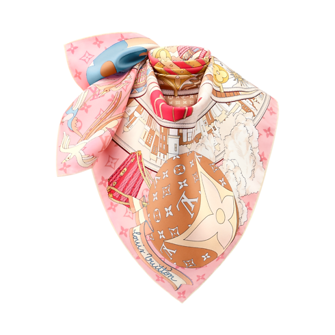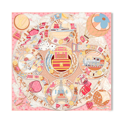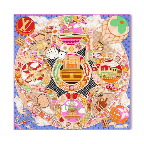 Este pañuelo LV Journey de seda es una pieza extraordinaria inspirada en el mundo de los viajes. Luce un alegre estampado intrincado que combina ilustraciones de equipaje, globos aerostáticos, trenes, barcos y aviones, con dados, nubes y los distintivos motivos Monogram y Damier. Su diseño llamativo y atemporal convertirá, sin duda, este accesorio en un icono.