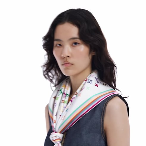El pañuelo Monogram Multicolor 90, confeccionado en pura seda con acabado brillante, pertenece a la creativa colaboración entre Louis Vuitton y Takashi Murakami. Este lujoso accesorio destaca por la vistosa reinterpretación que hace el célebre artista japonés del icónico motivo de la Maison, estampado en 33 colores vivos de alta definición sobre un fondo blanco. El diseño se completa con un borde a contraste, que evoca el marco de una obra de arte.