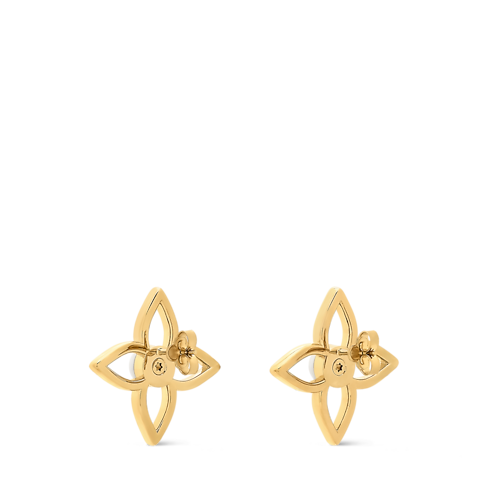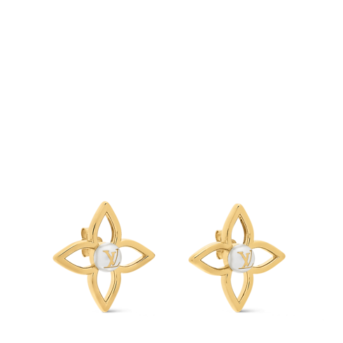 Estos pendientes de botón Pearly Flower, elegantes y discretos al mismo tiempo, combinan un clásico detalle distintivo de Louis Vuitton con la belleza atemporal de la perla. Presentan una flor Monogram metálica de color dorado con diseño calado, que rodea una perla de resina blanca y brillante, realzada con el logotipo LV Initials. Este modelo es ideal para añadir un toque femenino y atemporal al look.