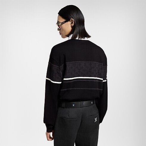 Este elegante polo de manga larga, una versión renovada del clásico modelo de rugby, está elaborado en suave algodón orgánico negro. Presenta un motivo Monogram tono sobre tono con una sutil textura sobre una banda gris y negra en el pecho y las mangas. Se completa con un parche bordado con la inscripción «Marque L.Vuitton Déposée», botones con efecto nacarado y unas llamativas rayas a contraste con efecto tridimensional.