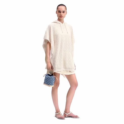Este poncho largo de corte holgado es una prenda cómoda, ideal para completar looks veraniegos. Confeccionado en mezcla de algodón y lana con acabado afelpado, luce un discreto motivo integral de flores Monogram en bajorrelieve. Se completa con una capucha con cordón, un bolsillo canguro oversize y bordes acanalados, que le confieren un sutil toque deportivo.