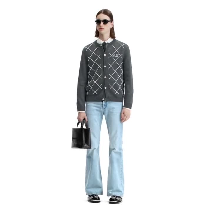 Esta rebeca gris oscuro, confeccionada en lana merino obtenida de manera responsable, ha sido concebida para la reunión familiar festiva en una casa de campo de la aristocracia británica de esta colección. La parte delantera luce un patrón Damier Argyle creado con exquisitas cuentas blancas con efecto nacarado, y se decora con un logotipo LV en el pecho. Esta pieza puede combinarse con una camisa de algodón para crear un elegante look informal de noche.
