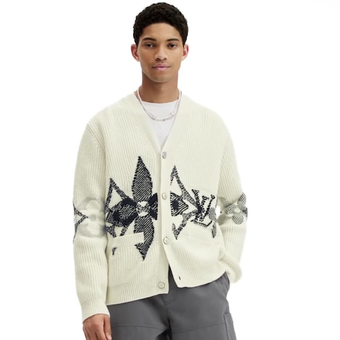 Esta rebeca invernal de lana presenta motivos distintivos gráficos de grandes proporciones, como el logotipo y la flor Monogram que se superponen para evocar copos de nieve en el torso y las mangas. Las puntadas en elegante punto de intarsia a contraste en gris y azul sobre la base blanca de punto elástico grueso crean un efecto altamente texturizado. Es una prenda ideal para las acogedoras noches de resort después de un día en las pistas de esquí.