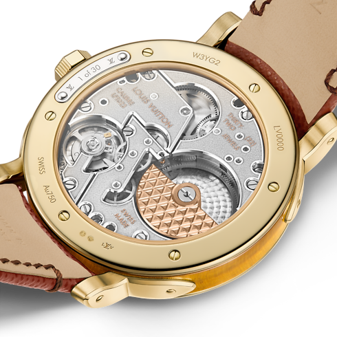 El reloj automático Escale de 40 mm, del que se ha fabricado únicamente 30 piezas en oro amarillo y ojo de tigre, es una demostración de rigor, innovación y elegancia. La pieza, que encarna una simbiosis de visión artística y precisión técnica, presenta una esfera central y una caja de ojo de tigre. Los singulares y fascinantes tonos dorado y marrón, así como las bandas fibrosas de cada piedra garantizan que no haya dos relojes iguales. Este reloj, una oda al arte de viajar de Louis Vuitton, conserva los detalles intrincados y refinados que evocan los icónicos baúles de la Maison. Impulsado por el calibre automático LFT023, este modelo exclusivo es una celebración del alto rendimiento en la medición del tiempo.
