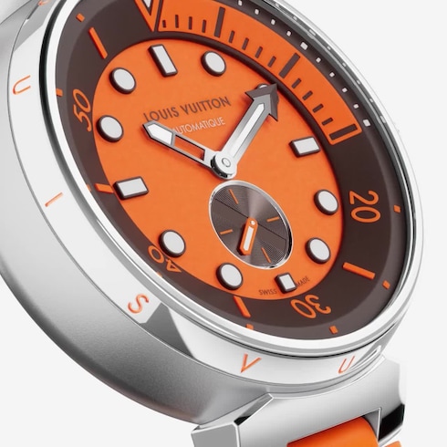 El reloj Tambour Street Diver, fabricado en Suiza, combina las características de los precisos modelos de submarinismo con el original estilo de la Maison. El práctico color naranja vivo, que garantiza una legibilidad óptima bajo el agua, aporta un toque vintage al llamativo diseño. Este accesorio deportivo, ideal para añadir un aire vistoso e informal a cualquier look, incluye una correa de goma a juego adornada con el distintivo Louis Vuitton.
