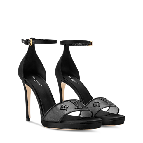 Esta refinada sandalia con plataforma Gala presenta una pala de malla translúcida, decorada con brillantes cristales de Swarovski™ que forman el motivo Monogram de Louis Vuitton. Incluye una fina pulsera con un pequeño cierre de hebilla en el tobillo, que le confiere un toque elegante. Se completa con un tacón alto de aguja y una discreta plataforma.
