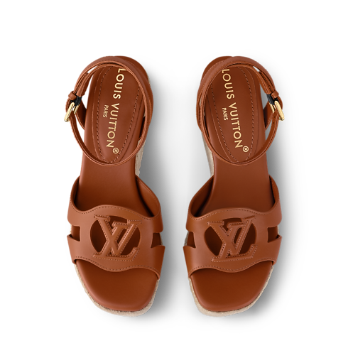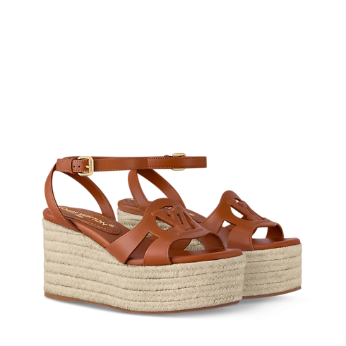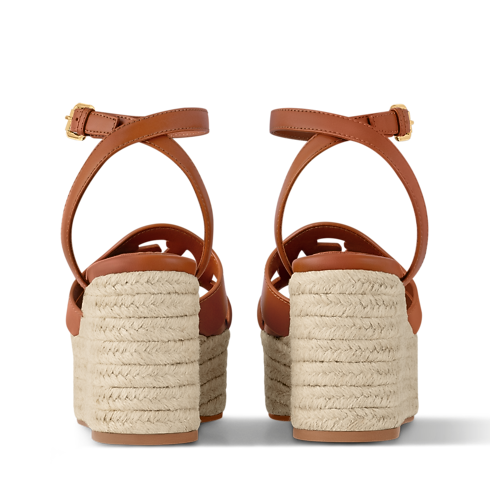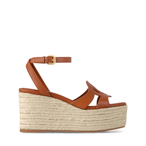 Esta elegante sandalia de cuña LV Isola, confeccionada en piel de becerro lisa, luce el característico logotipo LV Circle en el empeine. El diseño incluye una cómoda plataforma gruesa de esparto natural trenzado, que se inspira en la clásica alpargata. Se completa con una pulsera con una pequeña hebilla de color dorado.