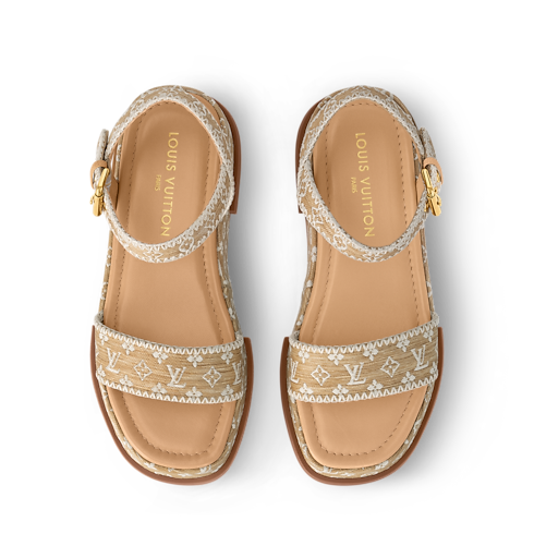 Esta versión refinada y artesanal de la sandalia Maya, elaborada en rafia, se adorna con un motivo Monogram bordado. Su elegante diseño presenta una versátil plataforma plana forrada en el mismo material y exquisitas puntadas decorativas en las dos tiras. El modelo se completa con una suela de goma.