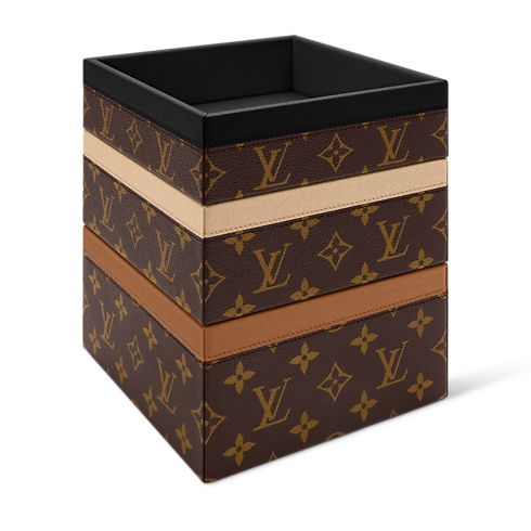 El set de cajas apilables Trinket se compone de tres cubos para guardar recuerdos con carácter y elegancia. Presenta una base de lona Monogram revestida, así como un interior y un borde superior en piel de una tonalidad refinada. Este accesorio, ideal para exhibir pequeños objetos en la mesa de centro o para optimizar el espacio en el escritorio, aportará una nota original y distintiva al hogar.