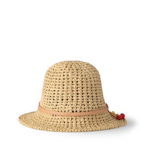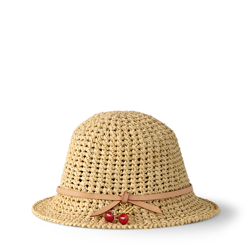 El sombrero Cerise LV x TM, un modelo ligero y fresco ideal para el verano, combina un detalle distintivo clásico de la Maison con un llamativo toque artístico. La pieza, elaborada en rafia, incorpora una tira en piel con un colgante LV Initials y dos brillantes cerezas, un vistoso elemento que protagoniza la nueva Colección Louis Vuitton x Murakami. Este accesorio práctico y elegante es perfecto para protegerse del sol con total comodidad.