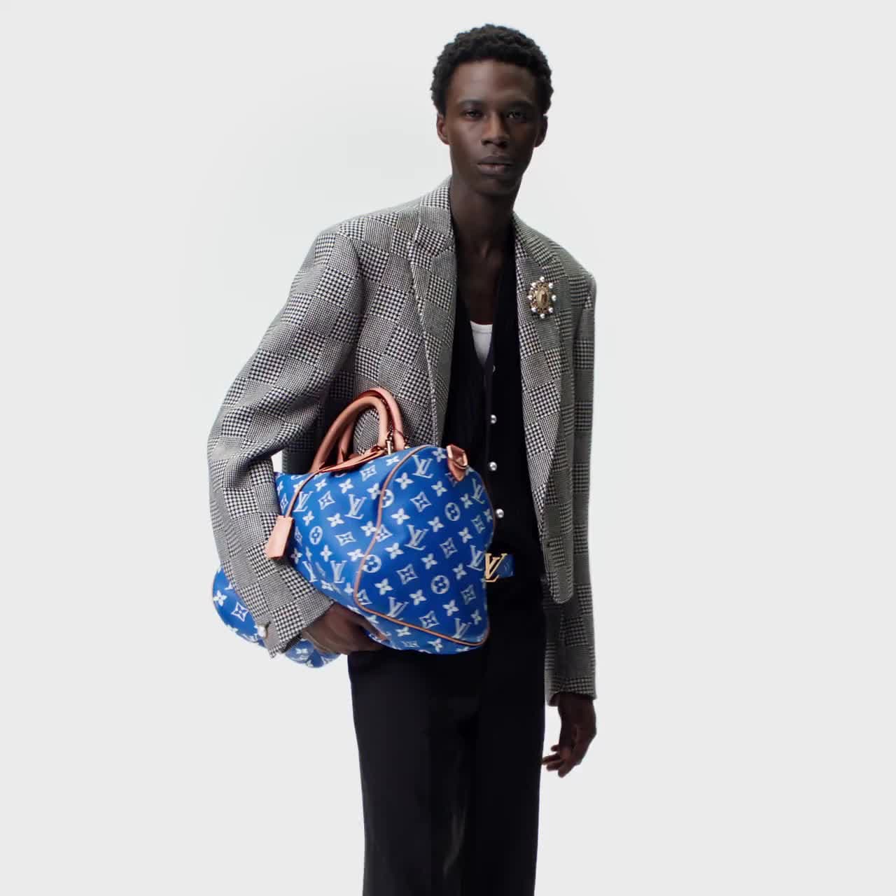 La bolsa de viaje Speedy P9 40 con bandolera, ideada por el director creativo Pharrell Williams, está elaborada en piel de becerro flexible y granulada de tacto muy suave. El estampado Monogram, realizado mediante una técnica de serigrafía de calidad superior, reproduce a la perfección el efecto casi difuminado que presenta este patrón sobre la lona. El modelo incluye un forro en lujosa piel de cordero.
