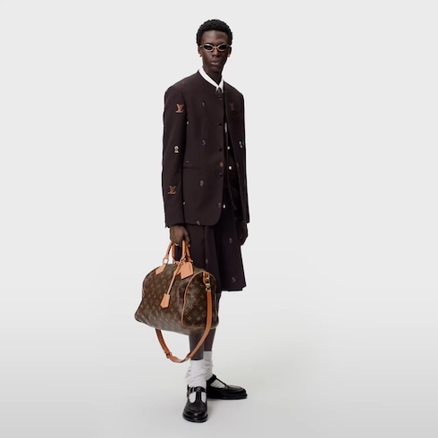 La bolsa de viaje Speedy P9 40 con bandolera, ideada por el director creativo Pharrell Williams, está elaborada en piel de becerro flexible y granulada de tacto muy suave. El estampado Monogram, realizado mediante una técnica de serigrafía de calidad superior, reproduce a la perfección el efecto casi difuminado que presenta este patrón sobre la lona. El modelo incluye un forro en lujosa piel de cordero.