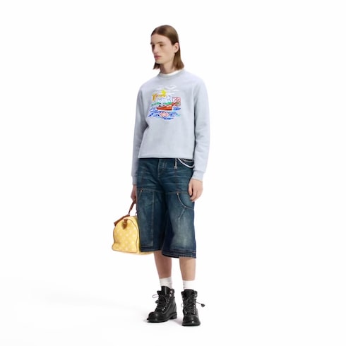 Esta sudadera de algodón suave en un versátil tono gris claro luce el llamativo bordado del desfile Otoño-Invierno 2025. El motivo distintivo celebra la larga amistad de Pharrell y Nigo, que se refleja en la colaboración para esta colección: los dos artistas aparecen representados en un barco pesquero en un entorno idílico. Una etiqueta con la inscripción «Marque L.Vuitton Déposée» en la parte trasera completa esta prenda informal.