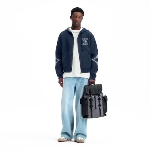 Esta sudadera azul con capucha y cremallera, elaborada en un tejido de punto de algodón en intarsia, incorpora unas líneas de puntos que crean un efecto de pespunte bordado. Está adornada con un logotipo LV a contraste en el pecho y una flor Monogram oversize en los codos, que aportan un toque distintivo gráfico. Esta refinada prenda de estilo informal puede llevarse como capa exterior ligera.