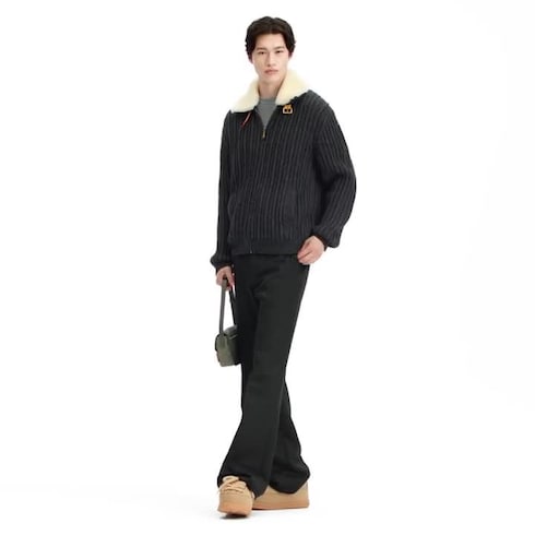 Esta sudadera con cremallera en gris oscuro se presenta en punto elástico grueso de cachemir y lana, que aporta una textura abierta. Incorpora un cálido cuello de lana de oveja, que puede ajustarse mediante una correa en piel VVN de color con hebilla, y un parche «Marque L.Vuitton Déposée» del mismo material. Una prenda elegante de estilo informal, perfecta para la temporada invernal.