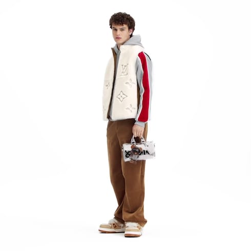 Esta sudadera deportiva con capucha es perfecta para relajarse en las vacaciones invernales en resorts. Confeccionada en suave punto de algodón en gris mélange, cuenta con inserciones rojas que aportan un toque atlético a las mangas y la capucha. Se completa con un parche bordado de Louis Vuitton en cursiva que añade un acento universitario en la manga derecha, y un parche LV tonal bordado en el pecho.