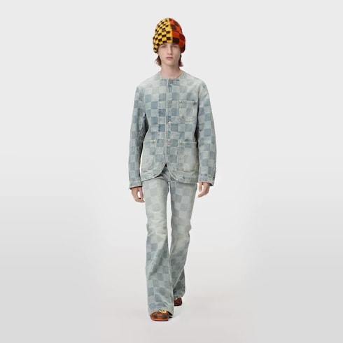 Este pantalón vaquero ligero con efecto lavado, visto en el desfile Primavera-Verano 2024, presenta un favorecedor corte acampanado. Destaca por el motivo 3D Damier realizado en Jacquard de la colección, cuyos cuadros texturizados con inscripciones «Marque L. Vuitton déposée» integradas aportan un toque moderno al icónico patrón de la Maison. Puede llevarse con la chaqueta a juego para crear un look de estilo actual.