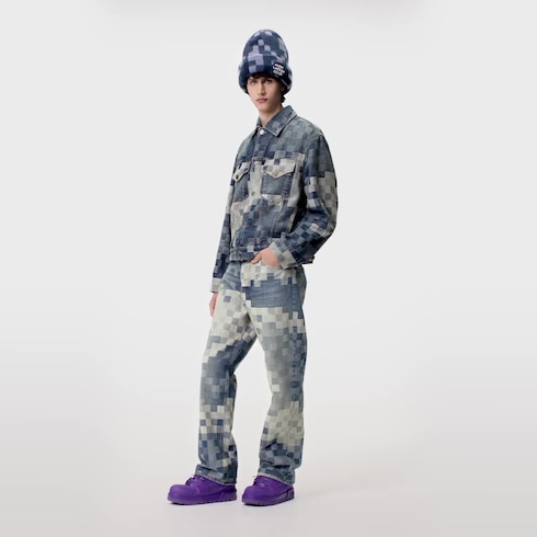 Este pantalón vaquero de estilo gráfico luce el icónico motivo Damoflage del desfile Primavera-Verano 2024, realizado en Jacquard con un refinado diseño en tono azul índigo con efecto lavado. Se realza con inscripciones «Marque L. Vuitton déposée» y un botón tipo joya. Esta pieza, tan informal como elegante, puede combinarse con una chaqueta a juego para crear un look de pasarela.