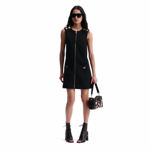 Este minivestido, confeccionado en dril de lana, destaca por su estilo elegante y atemporal. Su diseño ligeramente ajustado presenta pinzas estructuradas en los laterales, que le confieren un discreto aspecto de delantal. Incorpora unos botones repujados de color dorado en los hombros y la cadera, así como un cierre de cremallera vista tonal con tirador Monogram en la parte delantera.