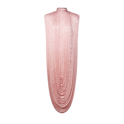 Este llamativo vestido drapeado, que rinde homenaje a la lujosa decoración del hogar, es una prueba de exquisita maestría artesanal. Confeccionado en brillante terciopelo con acabado reflectante, luce un discreto motivo floral realizado con técnica devoré, mientras que unos intrincados plisados en los hombros acentúan el movimiento del tejido. Este diseño, visto en el desfile, se completa con un sobrio cuello alto, que le confiere un toque estructurado.