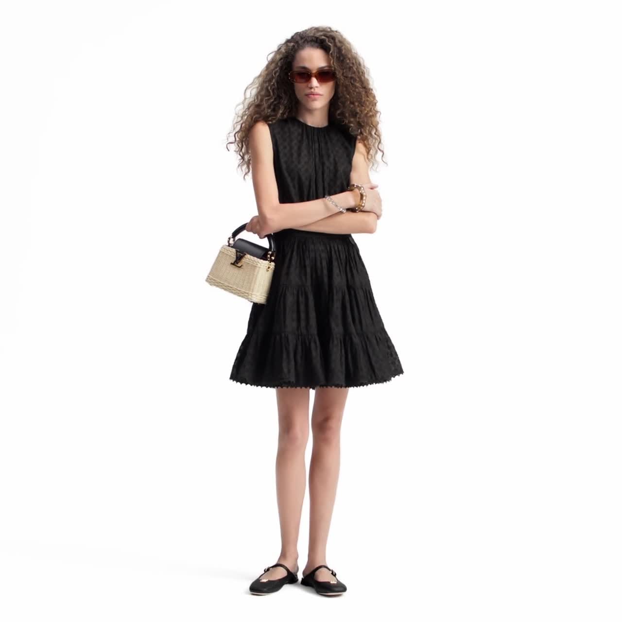 Este vestido, confeccionado en mezcla de algodón y seda ligera, presenta una parte superior entallada que contrasta con la voluminosa falda acampanada, realzada con fruncidos. La prenda luce un discreto estampado Monogram realizado en fil coupé, así como un ribete de flores Monogram en el bajo. Una cremallera vista de color dorado en la parte trasera pone el broche final.