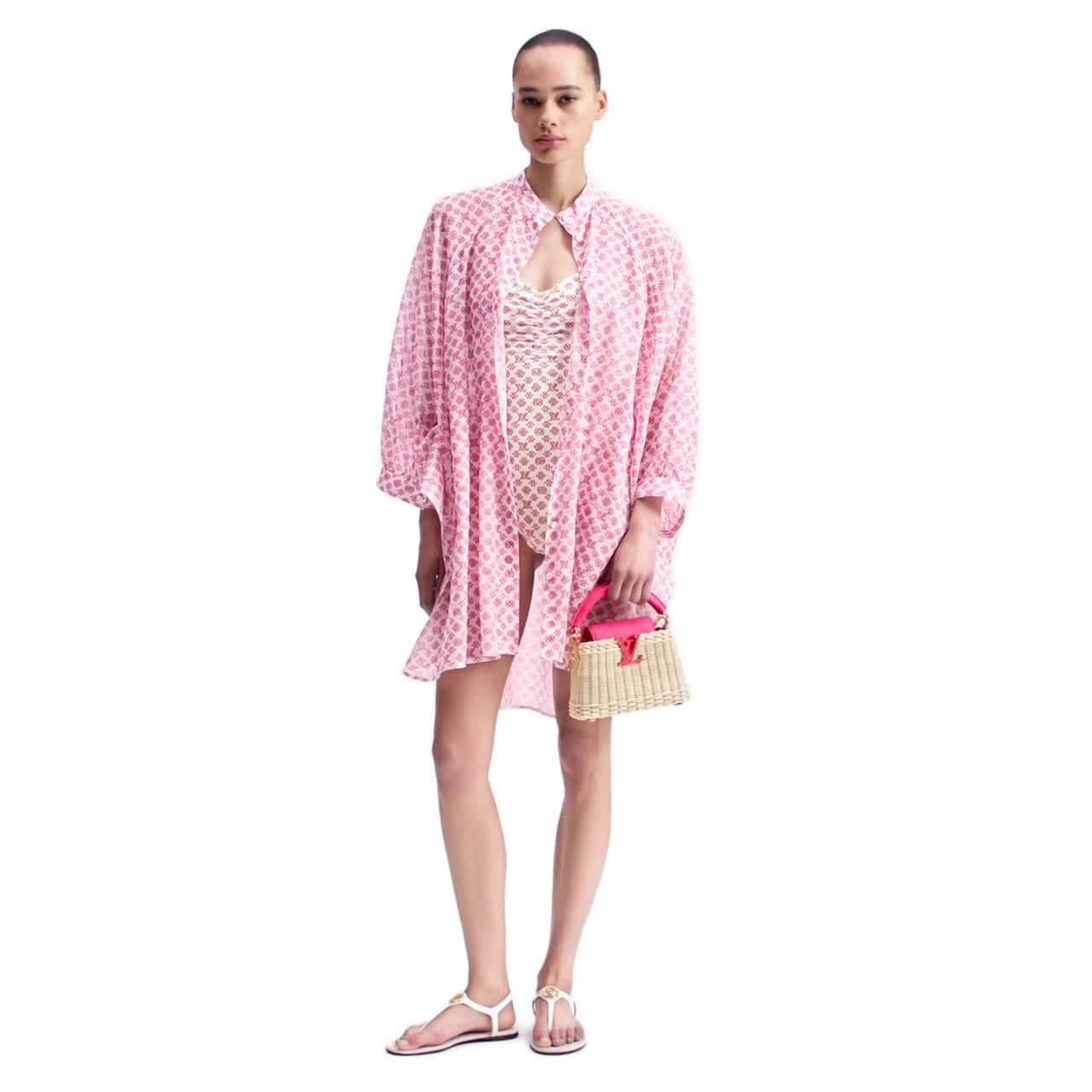 Este vestido camisero de manga larga se actualiza con un diseño elegante y veraniego en seda fluida. Luce un motivo integral Monogram sobre un fondo de rayas, así como ribetes florales a contraste en los puños y el bajo. Este modelo de corte amplio presenta un sobrio cierre de botones ocultos y un cinturón fino con una anilla en forma de D para crear una silueta más definida.