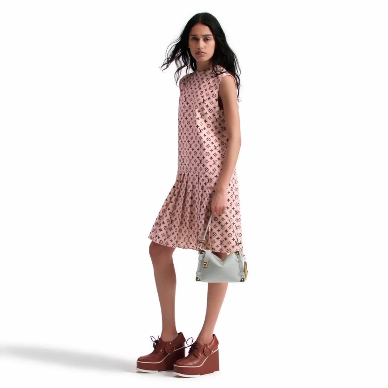 Este vestido de corte recto se caracteriza por el plisado romántico en la falda, que aporta volumen. Confeccionado en crepé de China de seda resistente a las arrugas en un suave tono de temporada, luce un motivo integral Monogram con un acabado desteñido de estilo gráfico. El cuerpo, de líneas depuradas, incluye una media cremallera vista en la parte trasera.