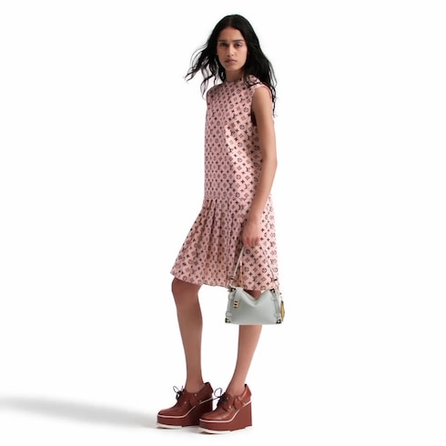 Este vestido de corte recto se caracteriza por el plisado romántico en la falda, que aporta volumen. Confeccionado en crepé de China de seda resistente a las arrugas en un suave tono de temporada, luce un motivo integral Monogram con un acabado desteñido de estilo gráfico. El cuerpo, de líneas depuradas, incluye una media cremallera vista en la parte trasera.