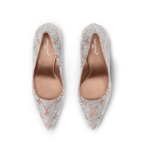 Este zapato de salón Gala en satén se adorna con cristales brillantes que revelan el motivo Monogram de Louis Vuitton. Este modelo de elegancia atemporal se distingue por la punta fina y el tacón alto de aguja, también recubierto de cristales. Combina a la perfección con una edición del icónico bolso Capucines.