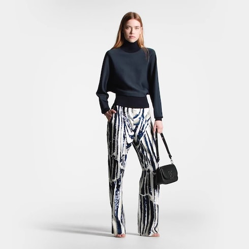 Celana menawan ini menampilkan kepiawaian desain Rumah Mode, melalui motif loreng abstrak yang terbuat dari bordir sequin. Celana model boot-cut ini hadir dengan finishing satin kontras di bagian pinggang. Sementara saku samping dan belakang yang praktis, serta penutup ritsleting tersembunyi memberi kesan elegan.